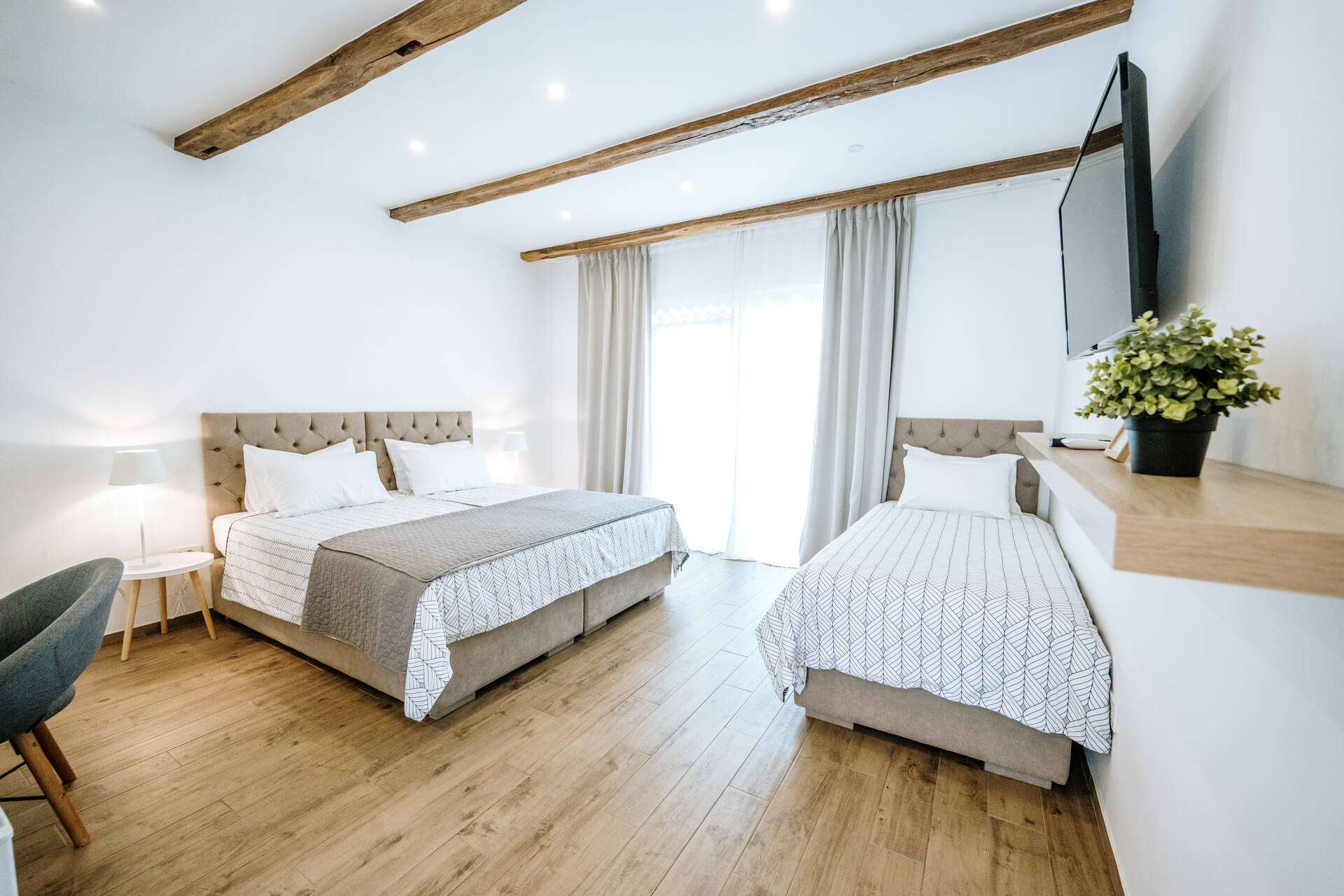 Ova soba omogućava poseban doživljaj s privatnim ulazom, kupaonicom, te pogledima na vrt, bazen i finsku saunu. Sadrži klima uređaj, besplatan internet i pametni TV, osiguravajući sve za ugodan boravak. S jednim krevetom za jednu osobu i jednim iznimno velikim bračnim krevetom, odgovara različitim potrebama gostiju.